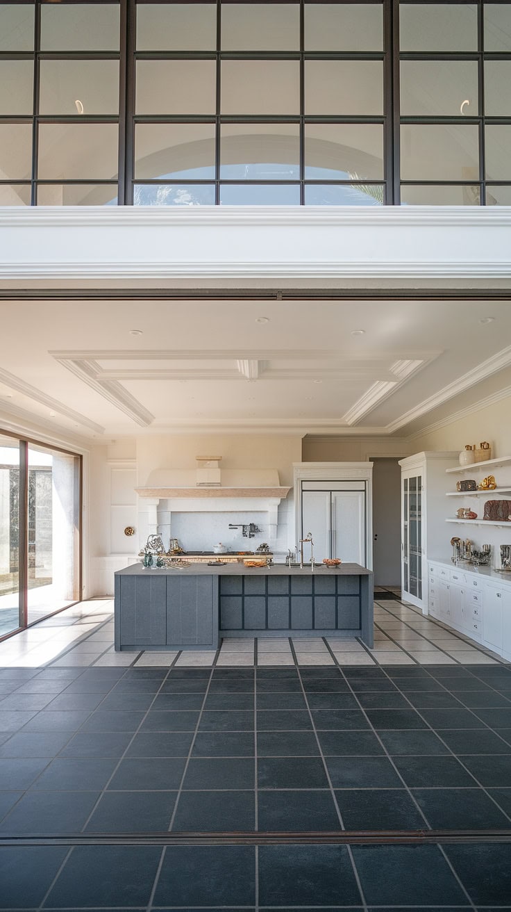 This expansive open-plan kitchen combines dark grey islands and sleek white cabinetry under floodlit spaces. Natural daylight highlights upscale finishes and creates an inviting atmosphere perfect for culinary exploration.