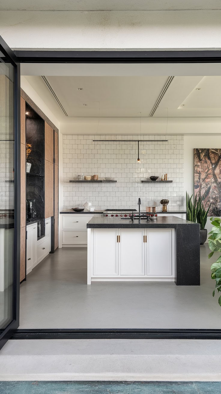An open layout kitchen with a standout island combining a black sink and white surface. The interplay of matte and glossy finishes offers textural complexity, creating a visually dynamic yet practical environment.