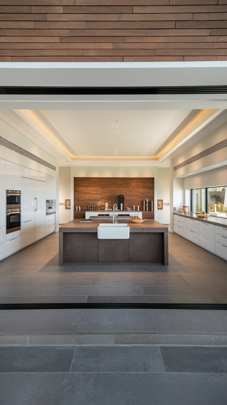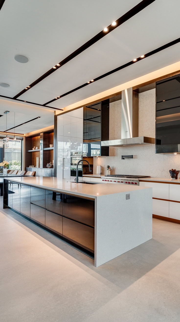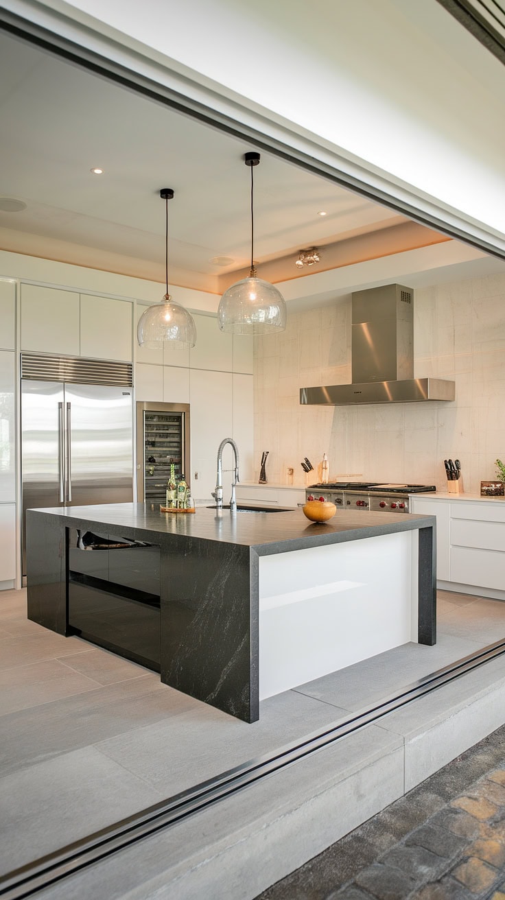 An elegant open-concept kitchen characterized by sleek lines and striking color contrasts. The large island, featuring a modern sink, serves as the centerpiece of the home, embodying effortless sophistication and contemporary style.