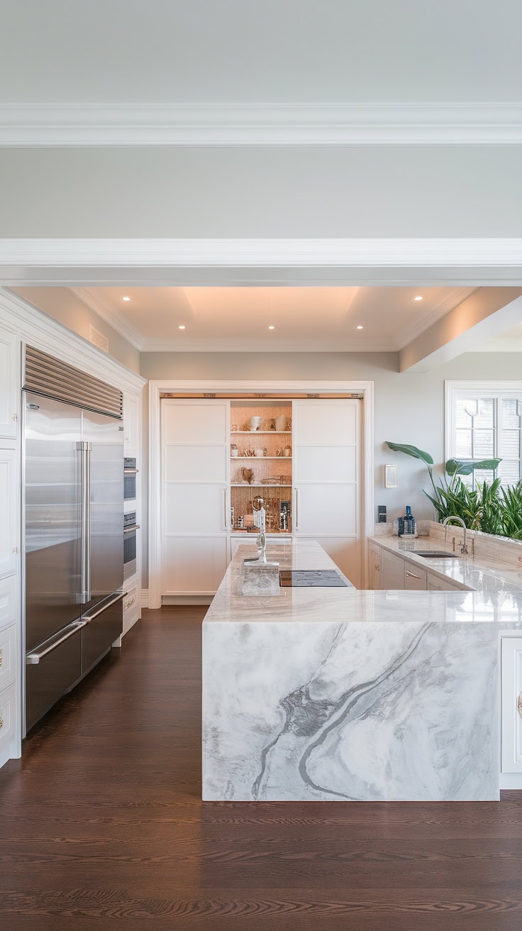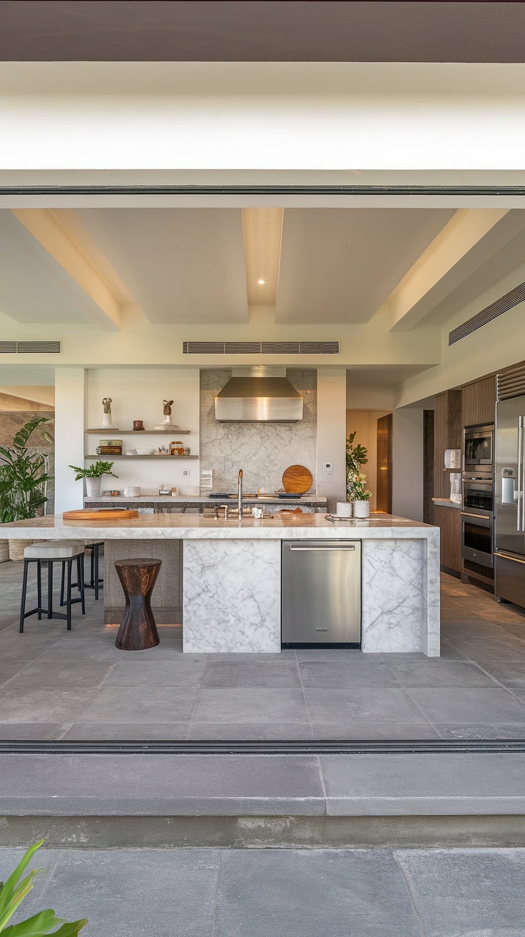 A redefined vision of modern luxury, this kitchen combines sleek stainless steel appliances with a magnificent marble island designed for casual dining and plentiful storage. Natural light enhances the space alongside vibrant indoor plants, crafting a warm, elegant environment. A celebration of sophisticated style and practical design.