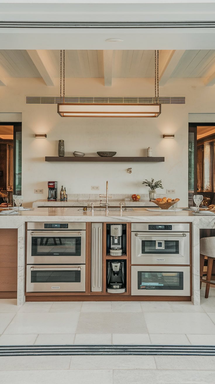 Modern elegance reached new heights in this open kitchen featuring a marble island equipped with dual ovens, built-in coffee station, and ample sink space. A chic floating shelf adds flair while spaciousness ensures seamless entertaining.