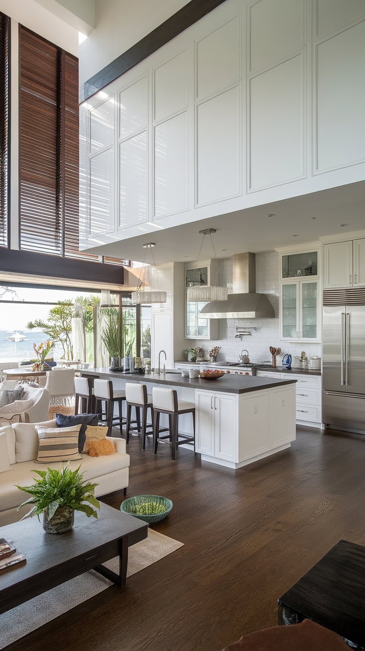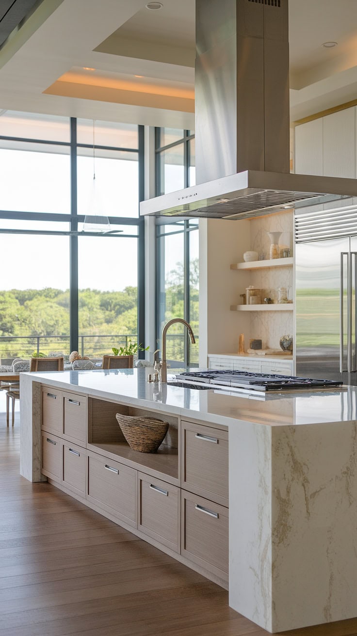 Elevating modern luxury, this open kitchen combines premium appliances, an expansive island with integrated sink, and awe-inspiring views. The warm hardwood floors and large windows framing lush greenery promote a relaxed yet sophisticated ambiance.