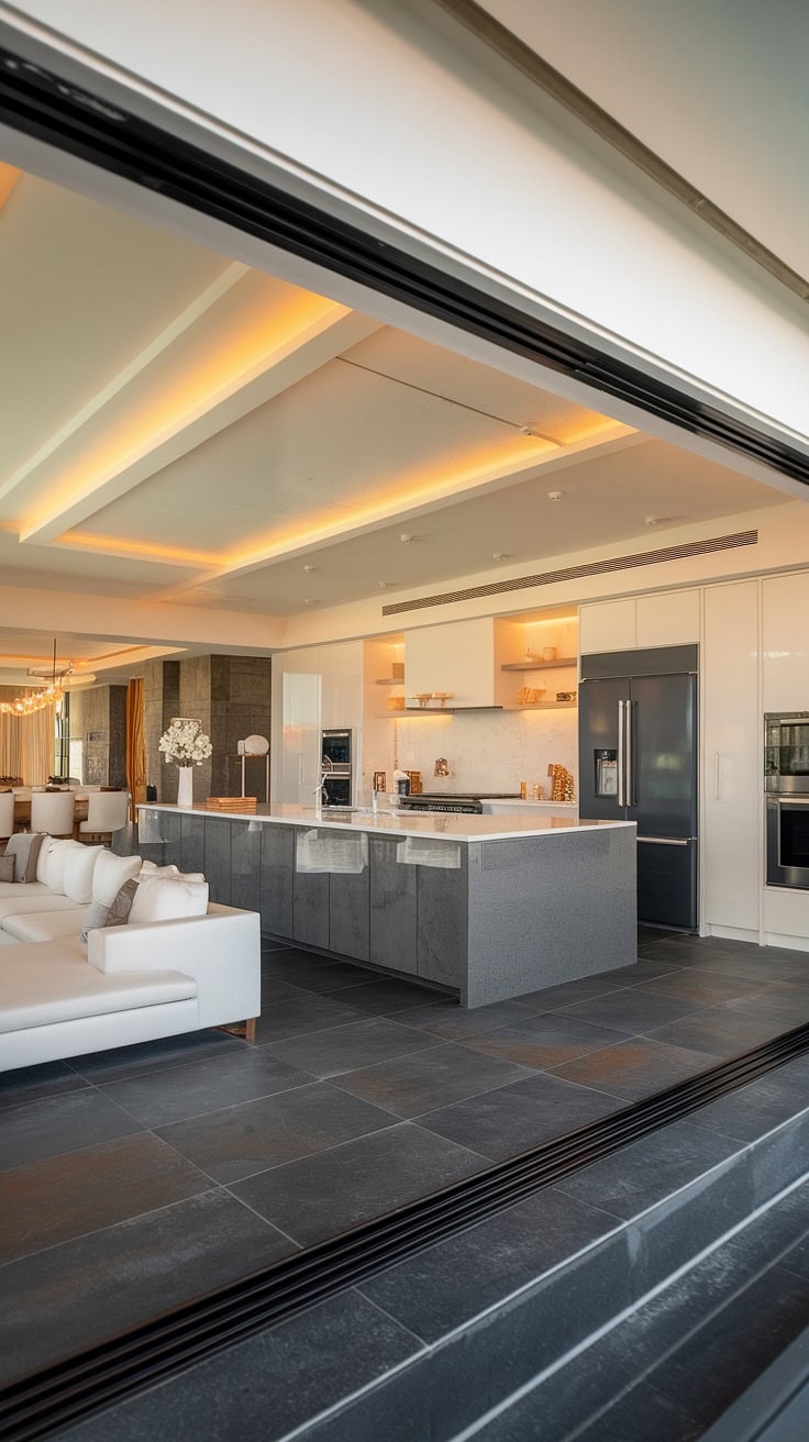 Showcasing a sleek open design, this kitchen presents pristine white cabinetry, a marble-topped island, and upscale appliances. The gray tile floor and curated decor perfectly balance elegance with warmth.