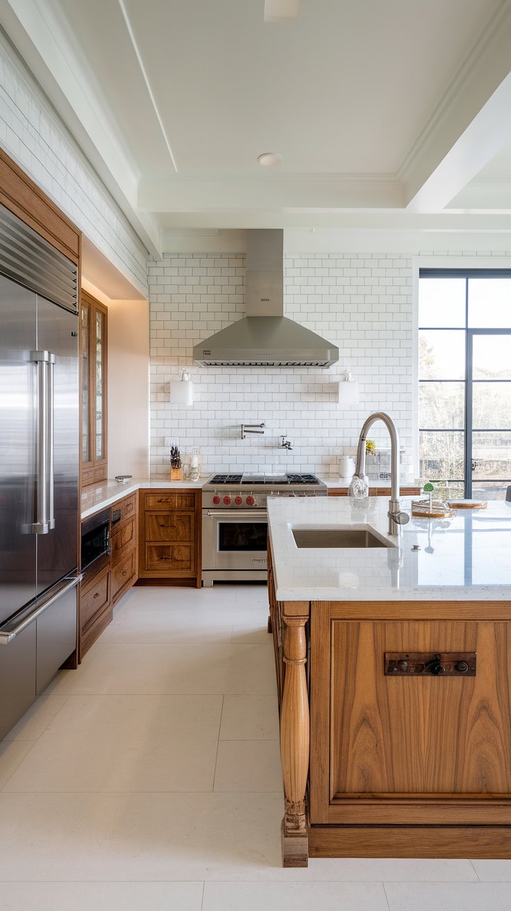 Radiant sun fills this expansive kitchen outfitted with gleaming quartz counters and timeless subway tile backsplashes. The centerpiece island offers a built-in sink and cutting-edge faucet, making this an ideal space for culinary endeavors and seamless hosting.