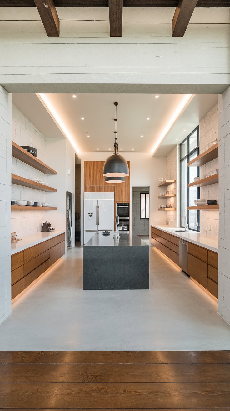 Elegant simplicity shines through this kitchen’s design. A broad island with a dark countertop anchors the space while white cabinetry and appliances brighten the atmosphere. Exposed wooden ceiling beams and floating shelves introduce charming rustic character.