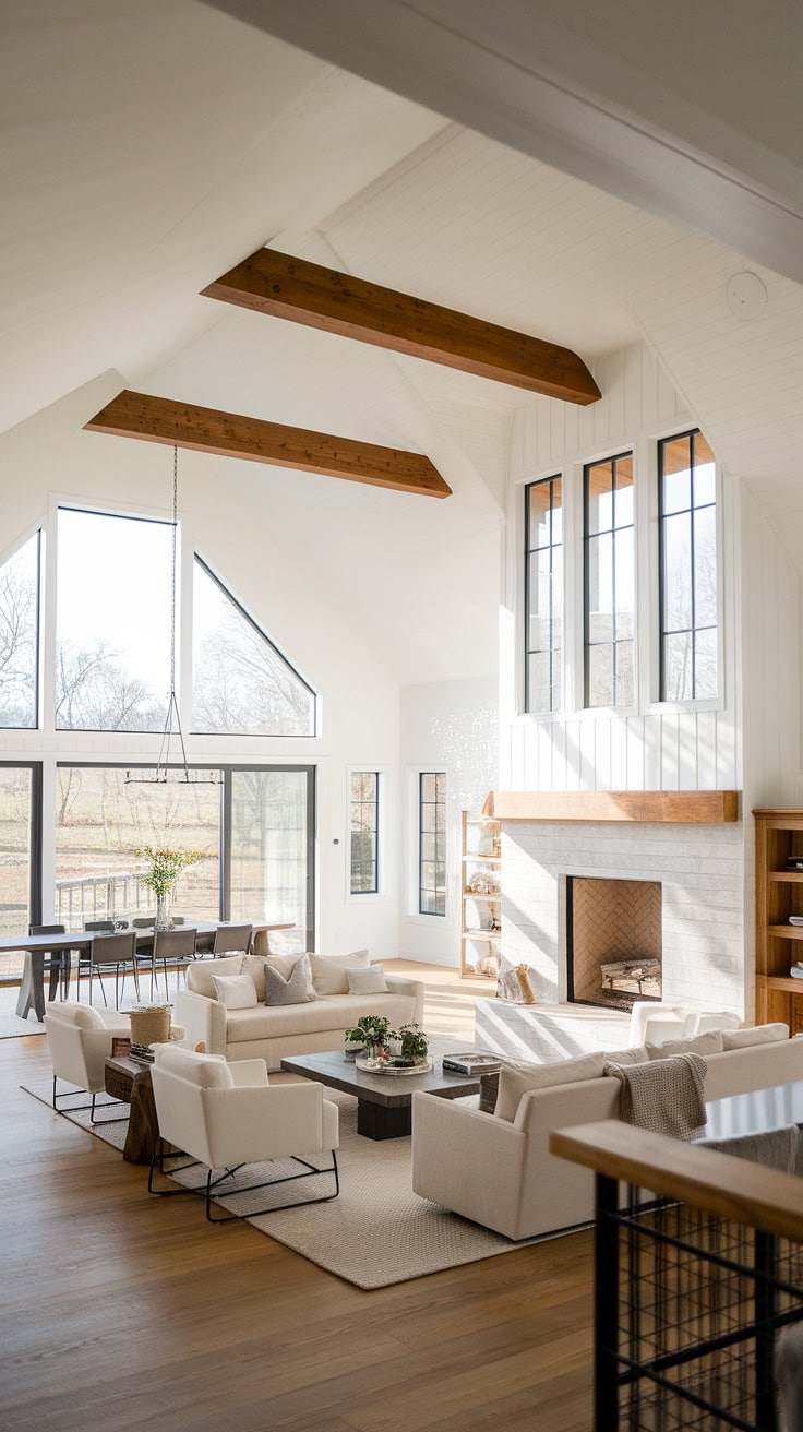Bathed in daylight, this modern farmhouse joins classic rustic elements with sleek minimalism, featuring a commanding fireplace beneath soaring vaulted ceilings to create a lively yet tranquil atmosphere.
