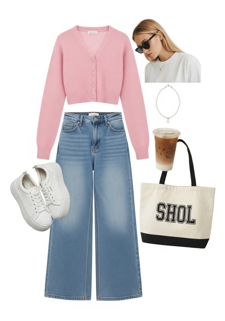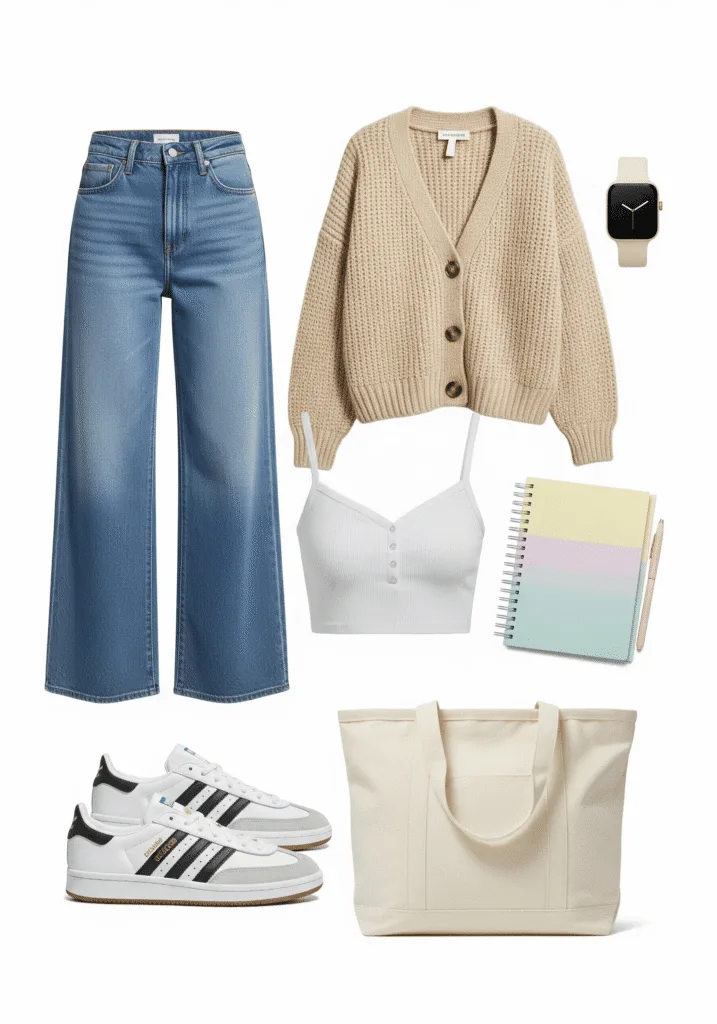 Channel a clean, modern vibe with wide-leg jeans, a soft beige knit cardigan, and a cropped white tank top. Add a pair of Adidas sneakers and a sturdy canvas tote for a simple yet chic finish.