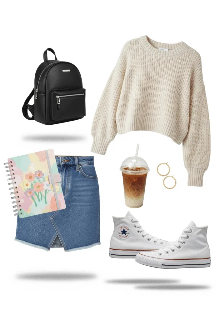 Combine casual comfort with cute appeal by pairing a denim skirt with an oversized cream sweater and low-top Converse sneakers. Accessorize with gold hoop earrings and a mini black backpack for a stylish campus-ready look.