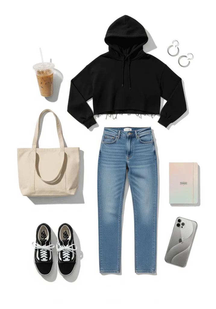 Sport a trendy, athletic-inspired outfit with straight-leg denim, a black cropped hoodie, and classic Vans sneakers. This look is perfect for navigating campus or late-night library sessions.