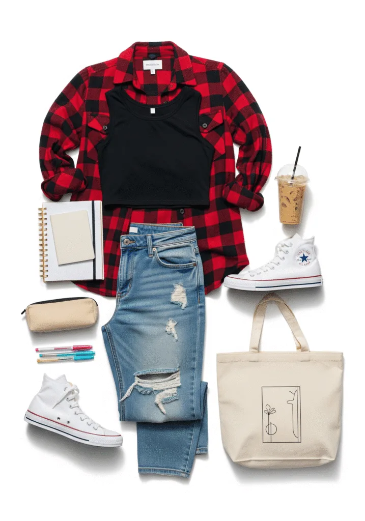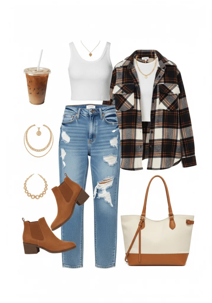 Try pairing ripped straight-leg jeans with a flannel shirt layered over a slim tank top. Add ankle boots and a practical tote bag to capture true autumn campus style.