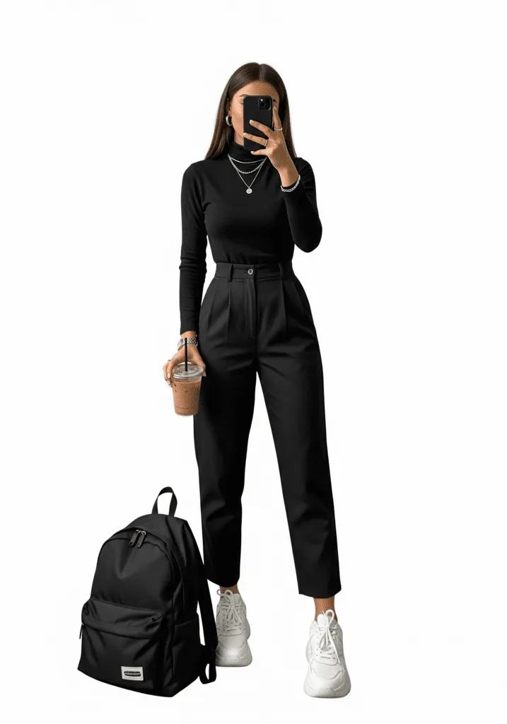 Opt for timeless simplicity by wearing a fitted black turtleneck with high-rise trousers coupled with chunky sneakers. Add shimmering silver jewelry to enhance the polished academic aura.