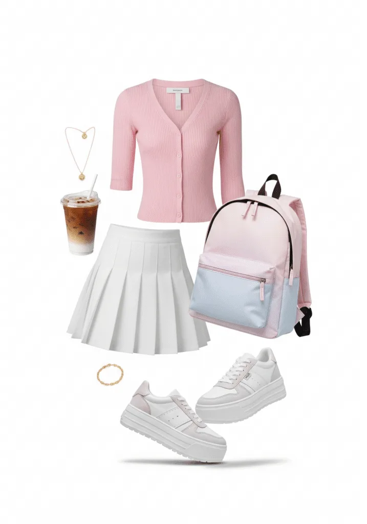 Wear a pleated tennis skirt matched with a tailor-fit cardigan and platform sneakers for youthful charm. A pastel-hued backpack brings the quintessential preppy flair.
