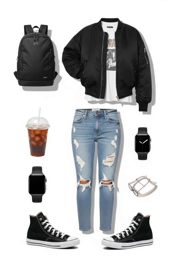 Keep it simple yet stylish with ripped skinny jeans, a statement graphic tee, and a bomber jacket. Complete the look with Converse sneakers and a sporty backpack for all-day campus comfort.