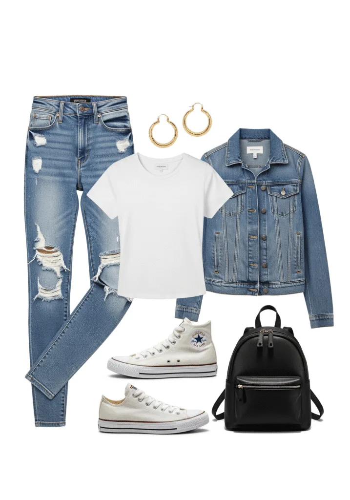 Show off your confidence by rocking a denim jacket with distressed jeans and a crisp white tee. Finish with Converse sneakers and subtle hoop earrings for a balanced street style look.