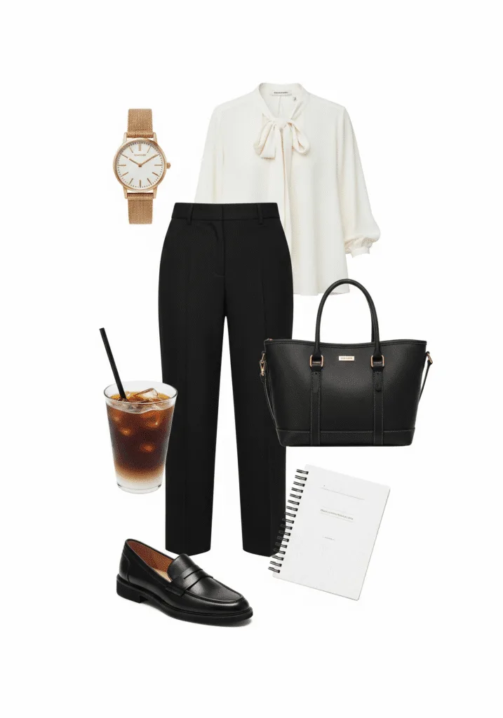For presentations or lectures, opt for tailored black trousers paired with a crisp white blouse, polished loafers, and a sophisticated structured tote bag.