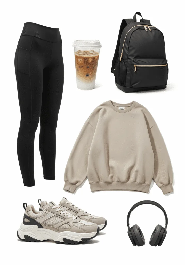 Combine black leggings with an oversized sweatshirt and chunky sneakers for maximal comfort and style. Don’t forget a sporty backpack and your favorite iced latte for on-the-go energy.