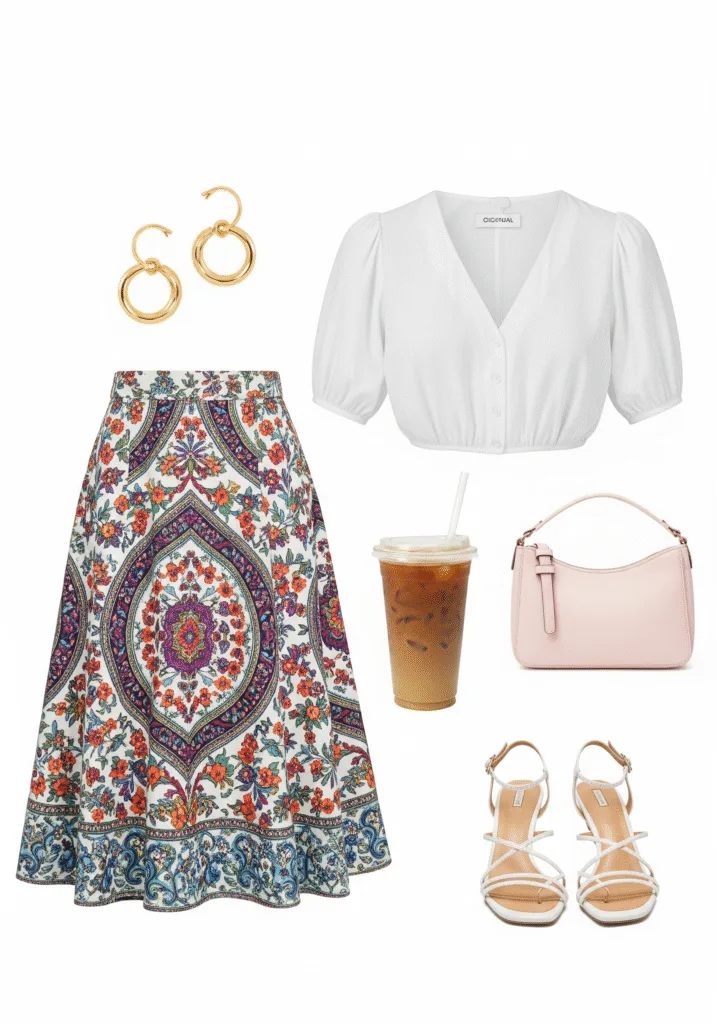 Make a memorable first impression in a floral midi skirt paired with a white cropped blouse and strappy sandals. Accentuate with gold hoops and a soft pastel handbag for romantic vibes.