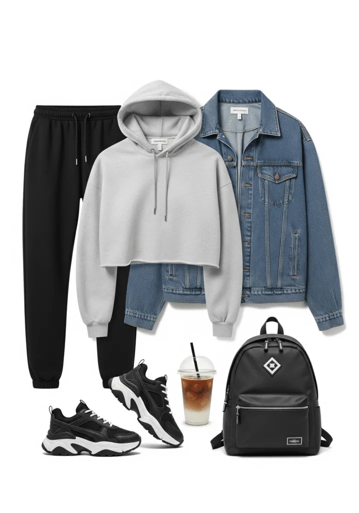 Combine comfort and style by wearing joggers with a cropped hoodie layered under an oversized denim jacket. Round off the look with chunky sneakers and a sporty backpack for all-day wearability.