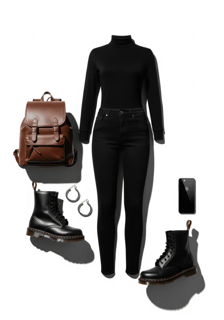 Stay sleek by pairing black skinny jeans with a fitted black turtleneck and iconic Dr. Martens boots. Accessorize with a leather backpack to add a contemporary edge.