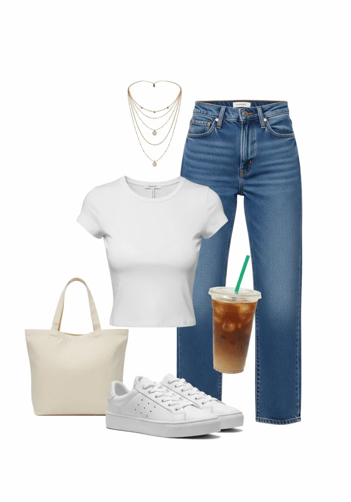 Stick with a timeless combination of blue straight-leg jeans and a fitted white tee, paired with crisp white sneakers. Accessorize with a canvas tote bag and layered necklaces for an understated yet elegant finish.