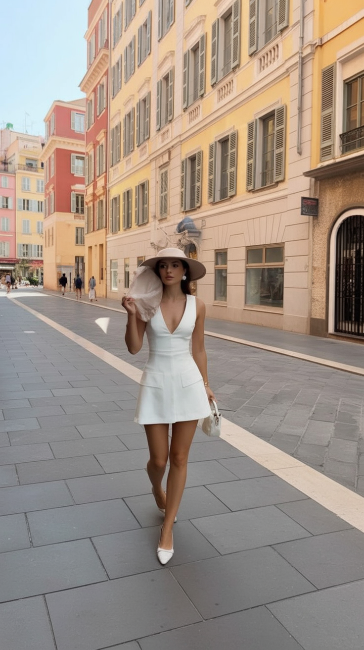 Channeling the effortless grace of a sun-kissed European stroll, pairing a crisp white mini dress with a structured wide-brimmed hat delivers an old money vibe that’s fresh and understated. This ensemble feels light yet commanding, blending femininity with quiet confidence.