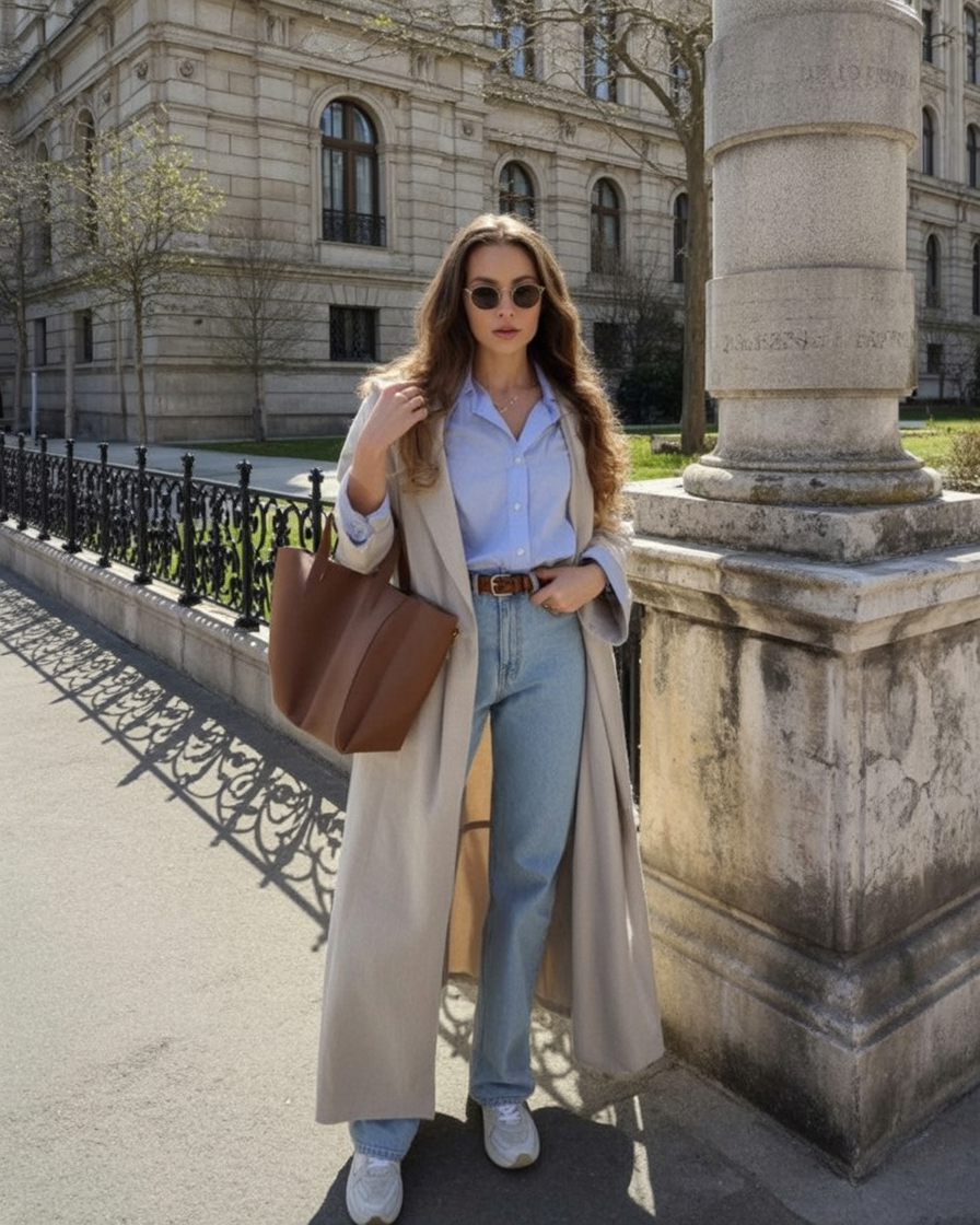 Layering a long, neutral-colored jacket over denim creates an effortlessly chic silhouette that balances structure and ease. The effect resonates deeply with old money ideals—composed, polished, and quietly elegant, making it perfect for urban strolls, casual meetings, or serene spring outings.