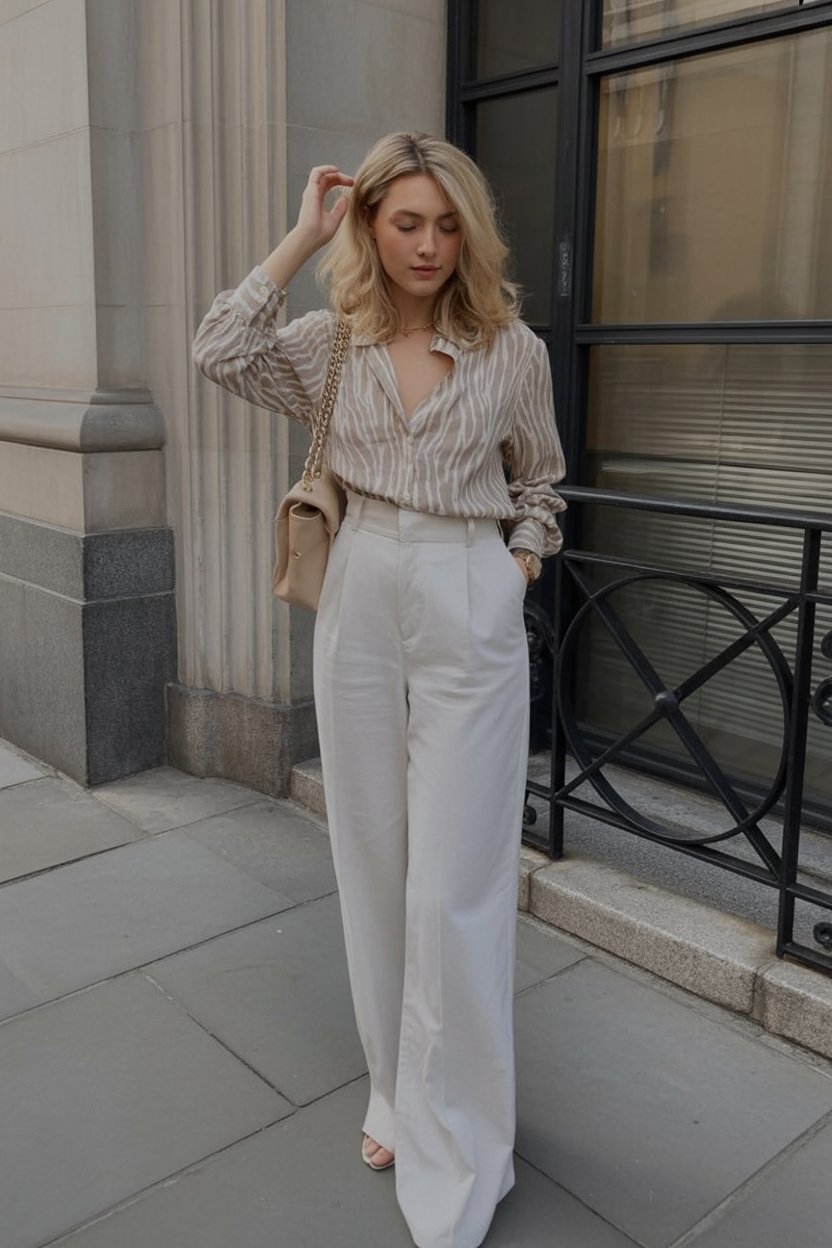 Combining texture and poise, a soft neutral blouse paired with sculpted white trousers crafts a silhouette brimming with relaxed sophistication. The overall look is understated with just enough character to feel distinctive.