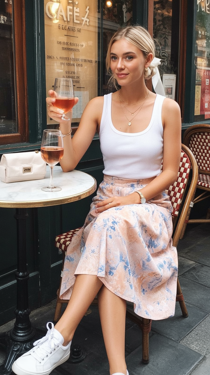 Blending gentle romance with practicality, floral skirts bring movement and softness while pairing elegantly with white tank tops to keep the look grounded. This ensemble exudes femininity without excess.
