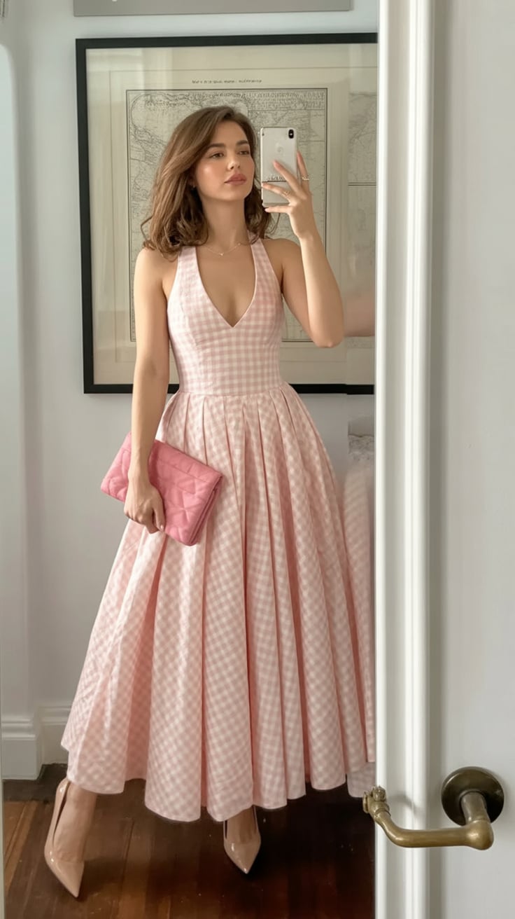 Gingham’s refreshing springtime appeal infuses dresses with a blend of structure and softness. This style embodies the charm of tradition fused with contemporary ease. It strikes a balance between grace and relaxed confidence, hallmarks of an old money ethos.