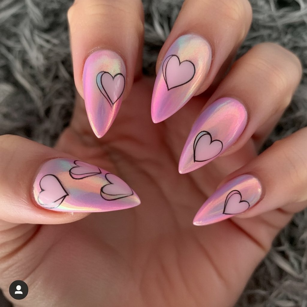 These nails shimmer with a translucent chrome finish, balancing futuristic softness with romantic heart outlines for a fresh take on Valentine’s glamor. Reflective yet subtle, this style elevates even casual outfits with an artful glow.