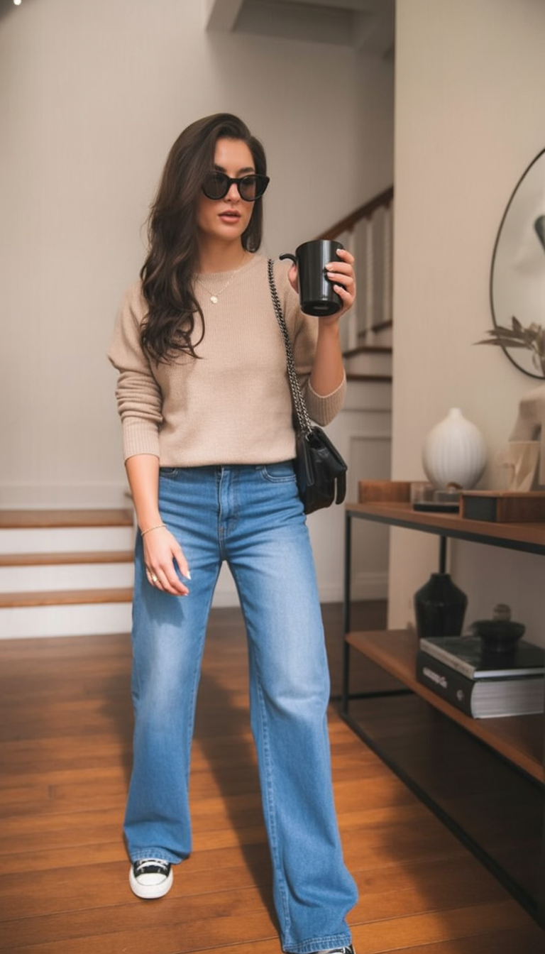 7. Effortless Morning: Neutral Sweater and Wide-Leg Jeans