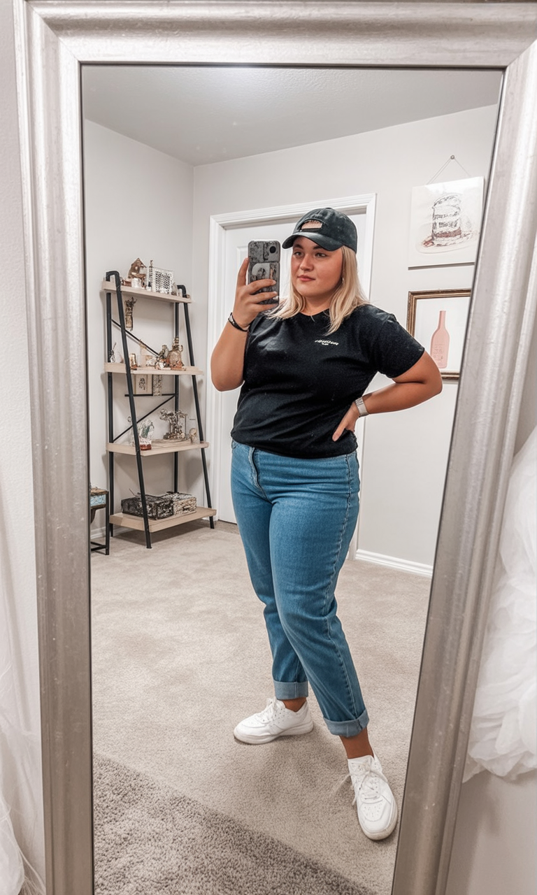 The ultimate on-the-go uniform features a classic black tee paired with [straight-leg jeans](https://www.amazon.com/s?k=straight+leg+jeans&tag=bonofashion-20), bright white sneakers, and a trusty baseball cap. This outfit perfectly balances sporty energy with everyday practicality, suitable for everything from school pick-ups to informal lunches.