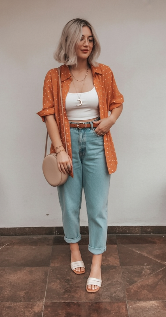 Celebrate sunny moods with an orange polka-dot blouse layered over a white cropped tank and light denim. Thoughtful accents like rolled cuffs, a slim belt, and a rounded crossbody enhance the ensemble’s easy sophistication—ideal for coffee dates, park outings, or evening patios.