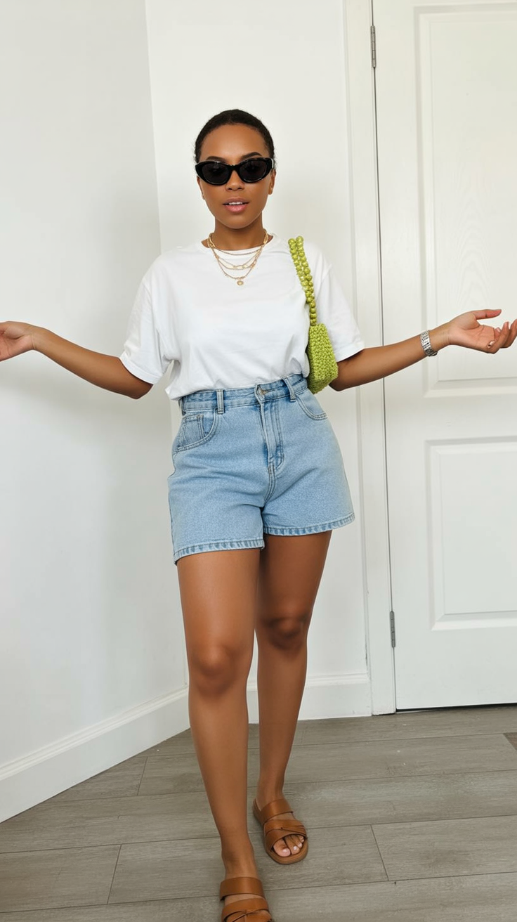A classic white tee tucked into high-rise denim shorts offers a foundational casual look enhanced by layered necklaces and sleek sunglasses for a current touch. An unexpected pop of color from a bright green handbag adds zest and intentionality, preventing the outfit from feeling plain.