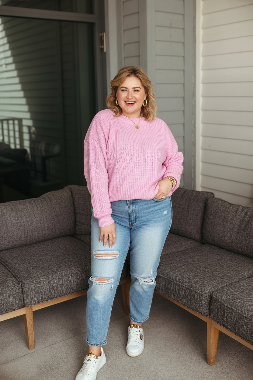 10. Vibrant Comfort: Pink Sweater with Ripped Jeans