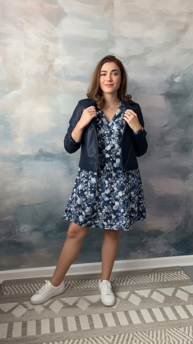 9. Edgy-Feminine: Floral Dress and Navy Leather Jacket