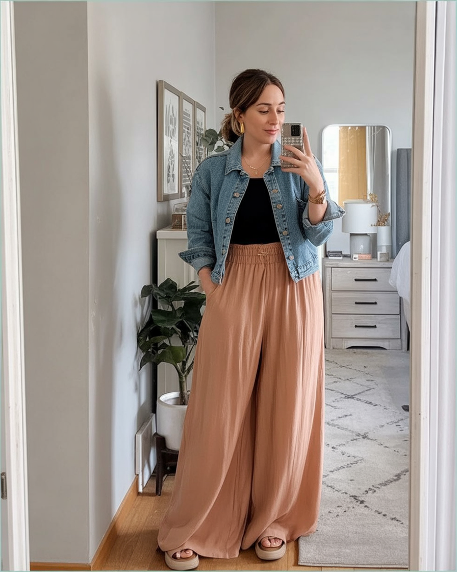 Comfort meets sophistication in this look combining soft, flowing neutral trousers with a fitted black tank and classic denim jacket. Platform sandals elevate the outfit, while bold hoop earrings and minimalist neckwear add subtle elegance. A seamless transition from grocery runs to school meetings, it delivers polish and ease in equal measure.