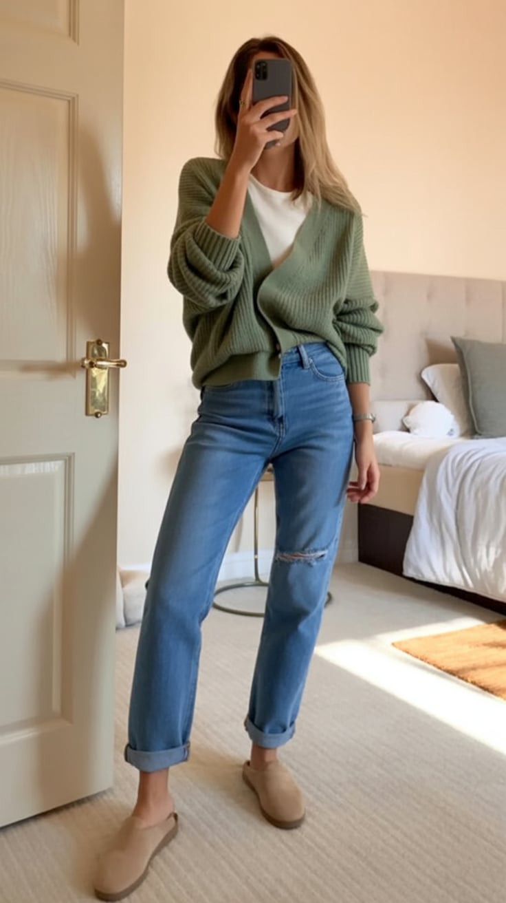 This ensemble is perfect for slow weekend mornings that might lead into spontaneous plans. A soft sage cardigan layered over a crisp white tee and relaxed jeans creates a tranquil and stylish vibe. Minimalist mules add polish, yet you can quickly shift to white sneakers and a crossbody for errands or coffee meetups.