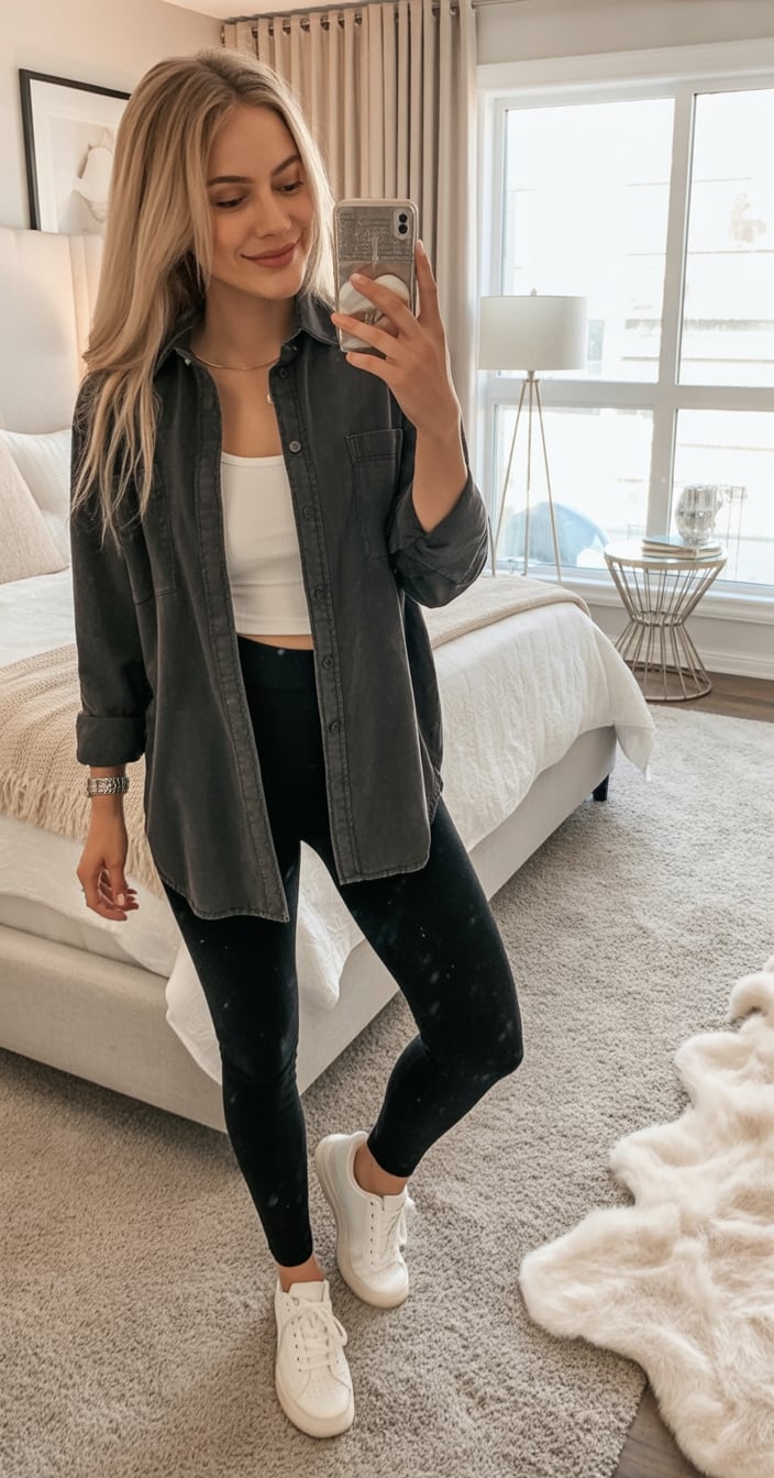 Think of this as a fashionable upgrade to lounge wear—fitted white tanks layered beneath oversized shirts in charcoal tones create an easy, laid-back vibe. [Black leggings](https://www.amazon.com/s?k=black+leggings&tag=bonofashion-20) keep the silhouette sleek, while white sneakers finish the ensemble with fresh simplicity.