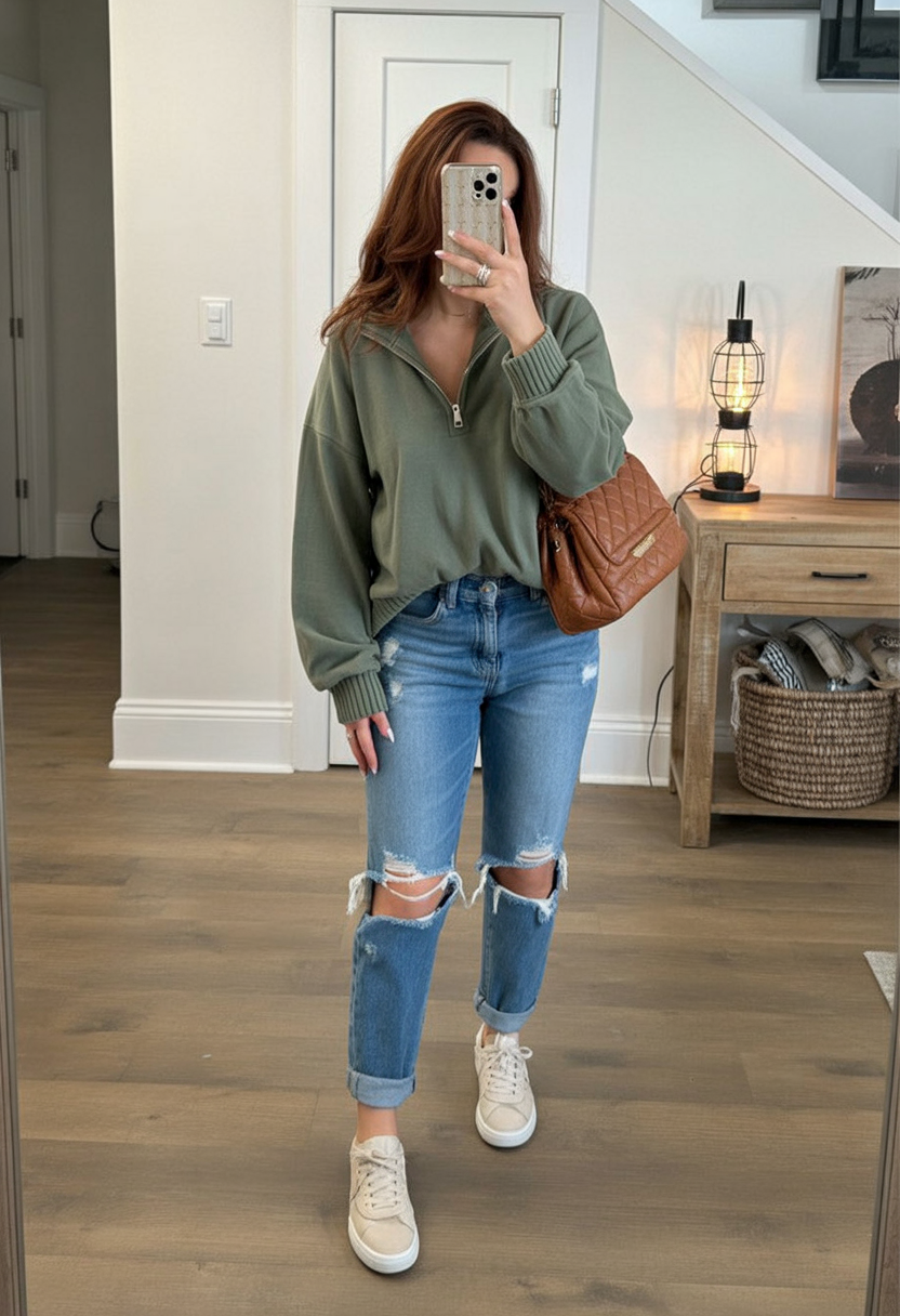 This look balances casual ease with sharpness: a sage half-zip sweatshirt pairs beautifully with high-waisted, [distressed jeans](https://www.amazon.com/s?k=distressed+jeans&tag=bonofashion-20) and neutral-toned sneakers. A quilted crossbody provides polish, making this versatile enough for school runs, bulk shopping, or quick meetups.
