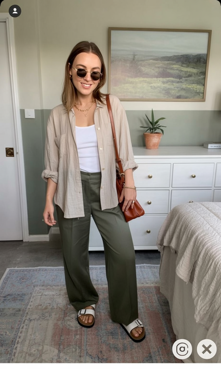 When jeans feel too familiar, switch it up with a soft beige button-down layered over a white tank and olive wide-leg trousers. White slide sandals, delicate layered necklaces, and a caramel crossbody complete this laid-back yet refined look—ideal for days that require comfort without sacrificing style.