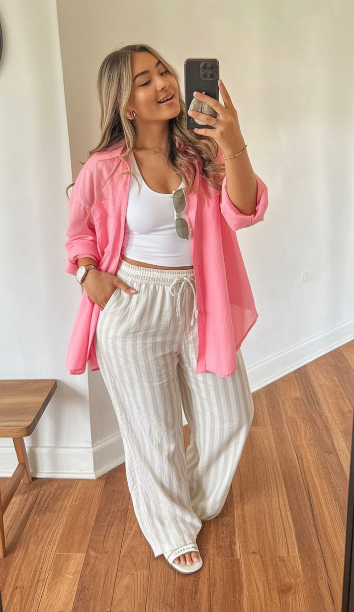 This outfit radiates fresh energy through a cheerful pink button-down paired with airy striped wide-leg trousers. Combined with a classic white tank and easy-to-slip-on slides, it’s an ideal look for summer errands, market visits, or carpool drives with the windows rolled down.
