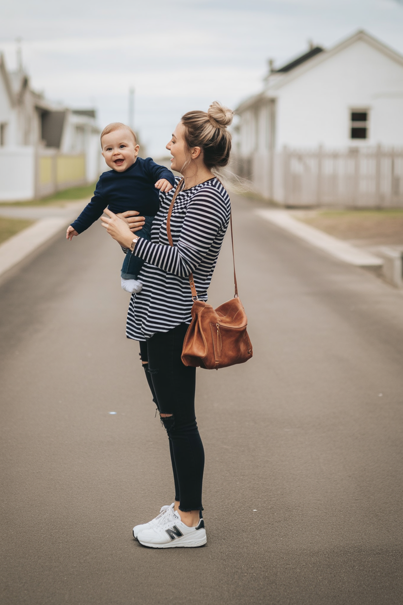 This ensemble captures the essence of carefree family walks. A cozy striped top paired with [distressed jeans](https://www.amazon.com/s?k=distressed+jeans&tag=bonofashion-20) offers a relaxed yet purposeful aesthetic. Combining these with clean white sneakers and a stylish leather crossbody bag elevates the look from simple to effortlessly fashionable, perfect for candid street moments or casual meet-ups.