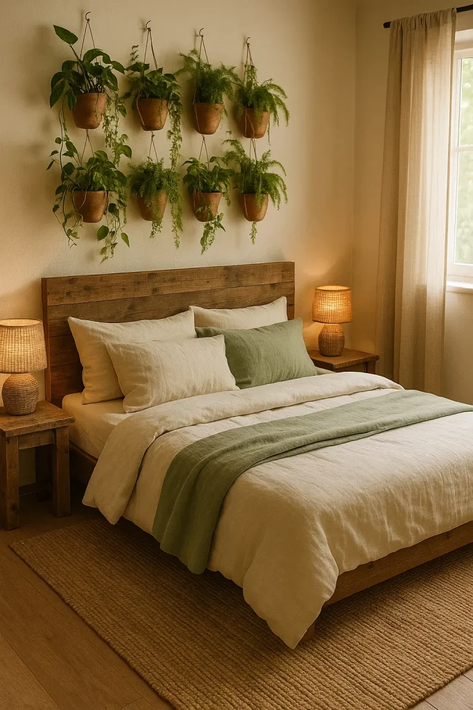 Visualize: A naturally warm space accented with greenery and reclaimed materials. Essential for a pinned eco-bedroom design!