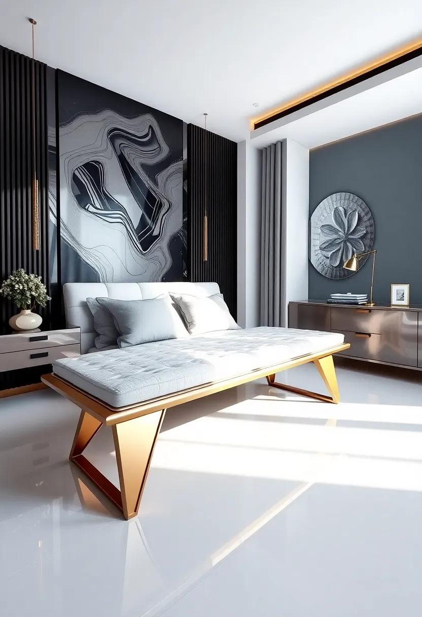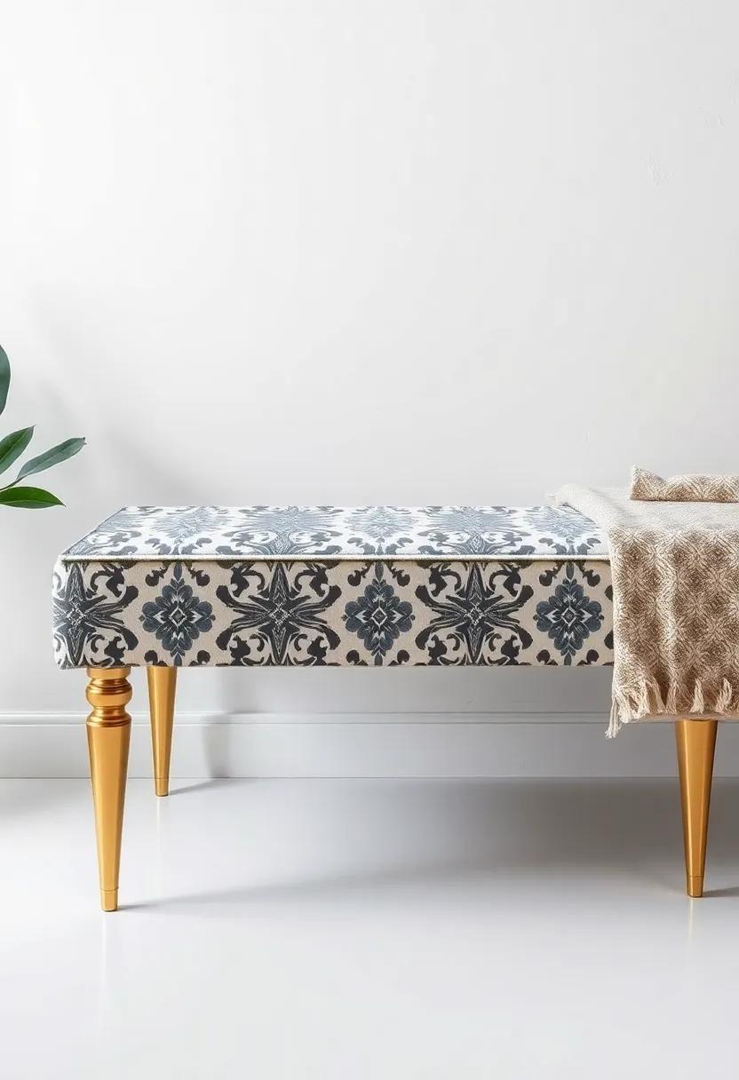the Statement Piece – A bold,oversized bench with a striking geometric pattern and gleaming gold accents,ideal for making a dramatic impact in your bedroom