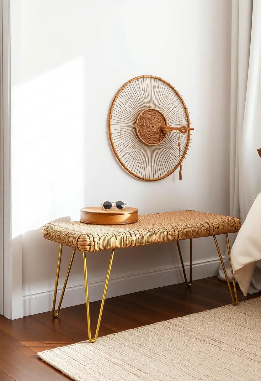 The Boho Chic Option – A woven rattan bench featuring gold metal legs, adding a casual yet stylish flair that complements bohemian-themed bedrooms