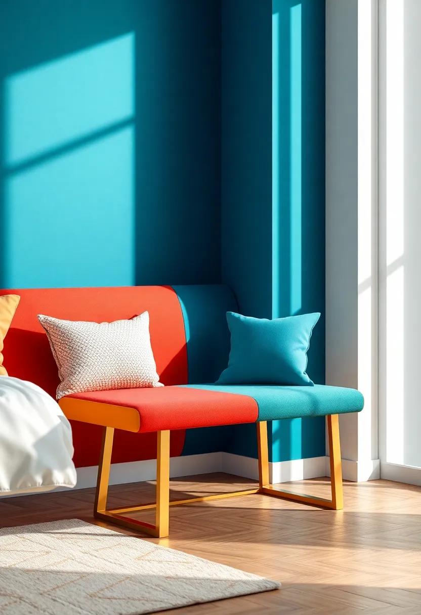The Bold Color Block – Dive into vibrant hues with this bold color-blocked bench, which features striking gold accents to elevate its contemporary aesthetic
