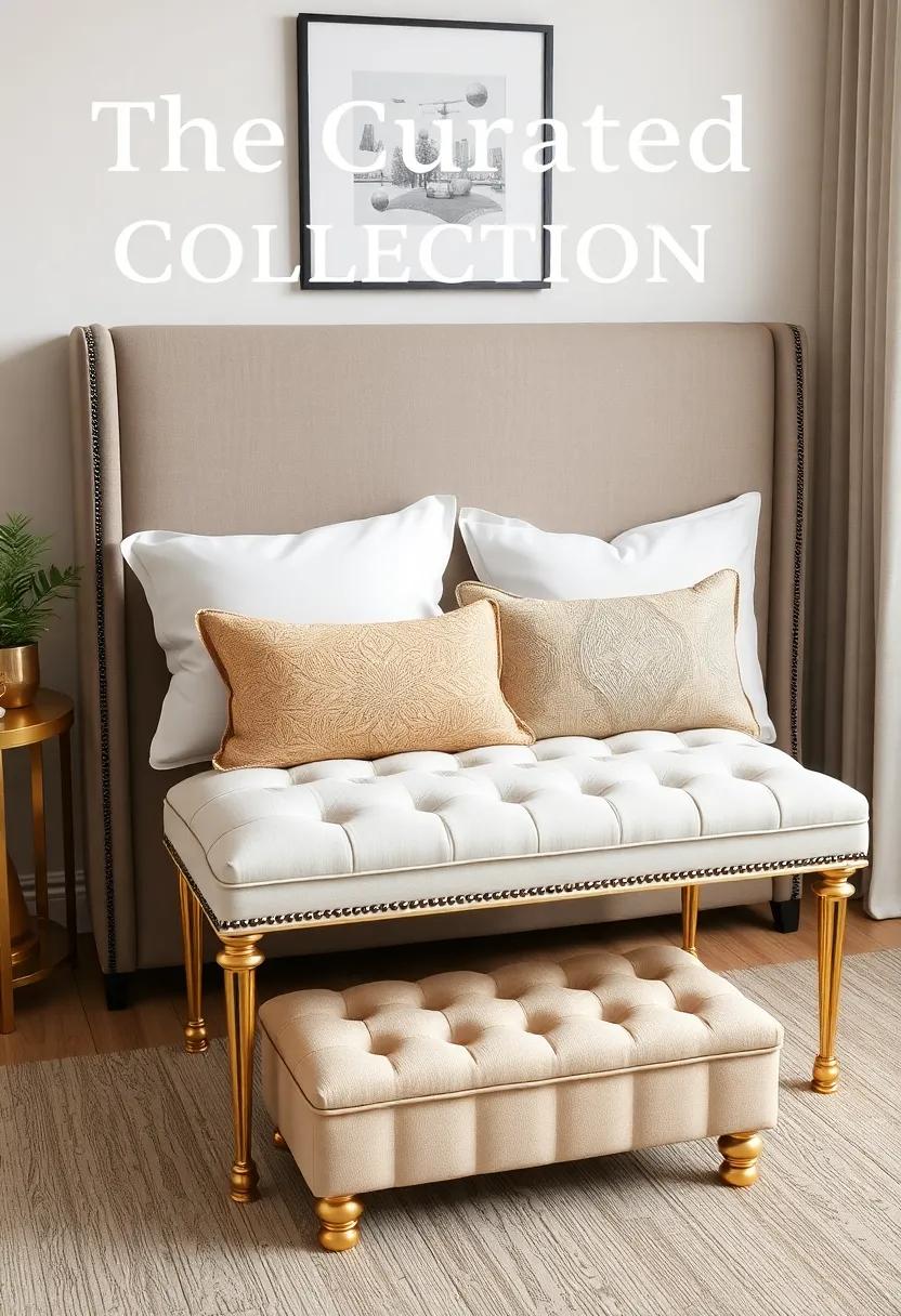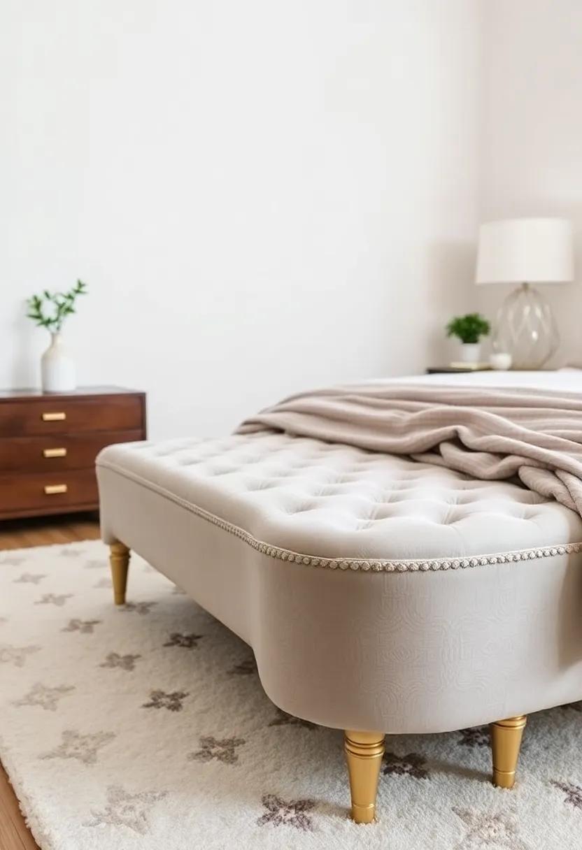 Imagine sinking your feet into a luxurious,plush ottoman that not only offers comfort but also elevates your bedroom’s aesthetic. This beautifully upholstered ottoman combines softness with a touch of elegance, featuring gold detailing that catches the eye and complements various décor styles. Strategically placed at the foot of your bed, it serves as a functional piece for stashing extra blankets or as a stylish seat when putting on shoes.The interplay between the sumptuous fabric and the gleaming accents creates a focal point that enhances the overall atmosphere of your bedroom.
