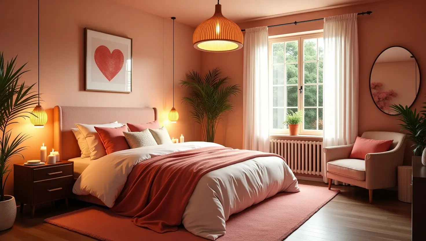Rich terracotta throws or cushions add a cozy glow that complements wooden furnishings beautifully. Paired with warm creams, the palette feels grounded and soothing. Incorporating woven wall décor introduces organic texture, reinforcing a calm atmosphere ideal for closeness and relaxation in a cozy romantic bedroom.