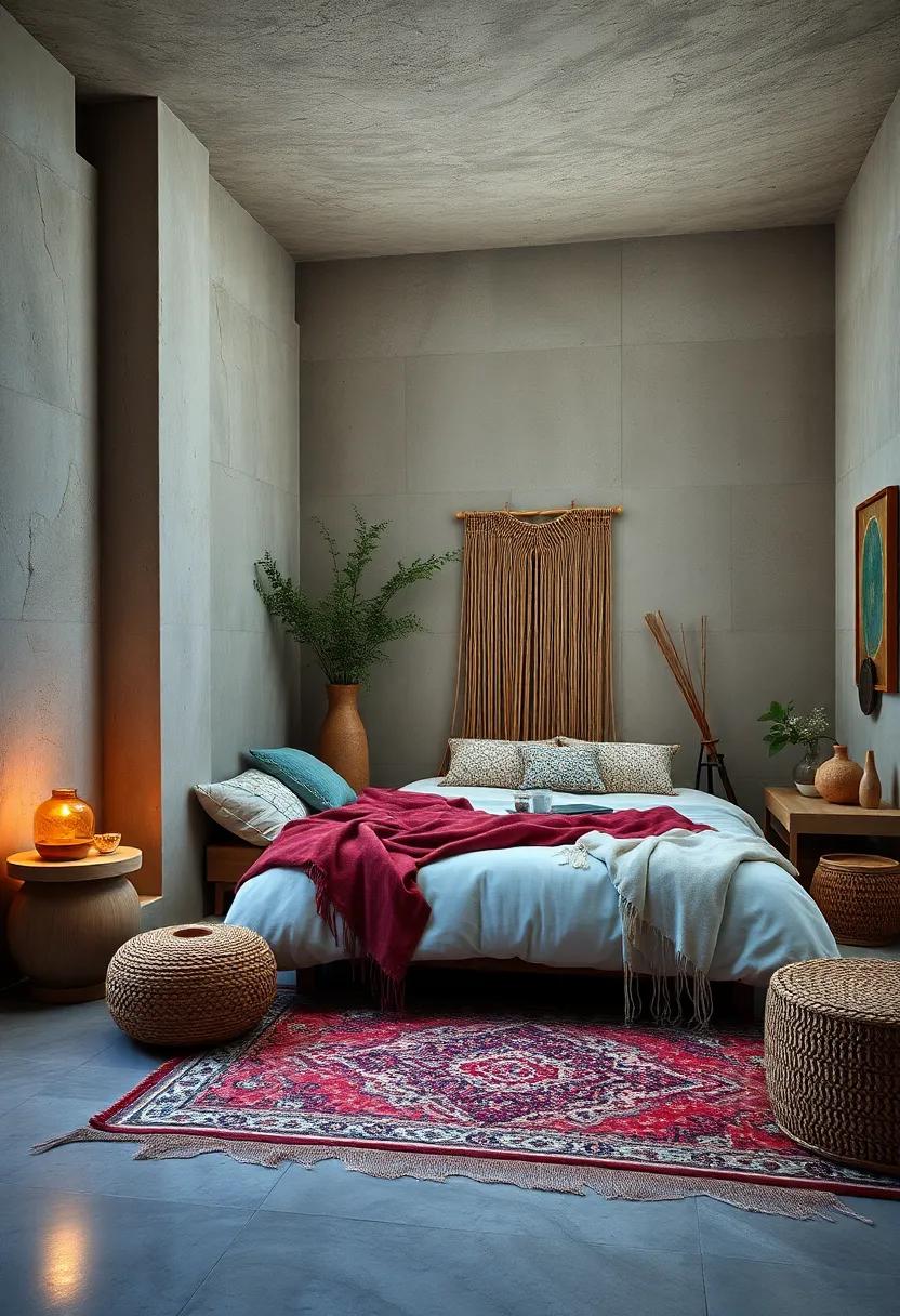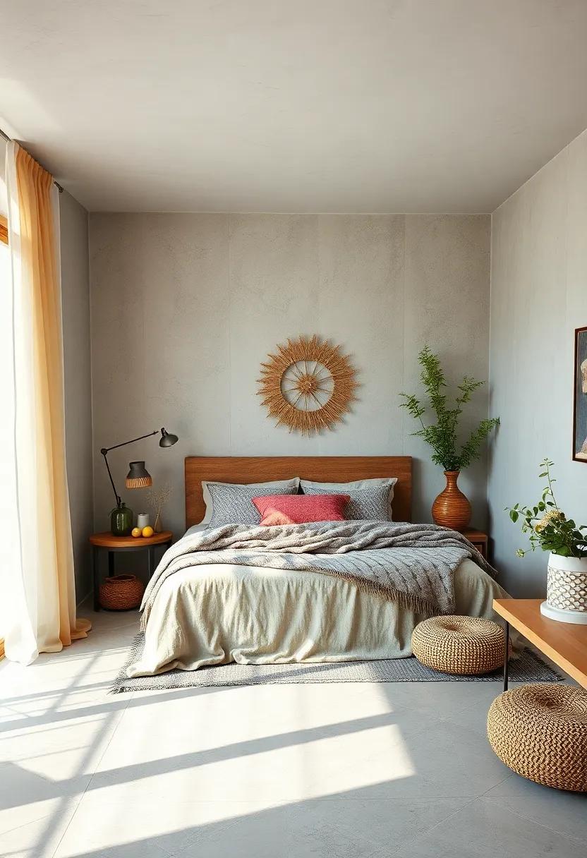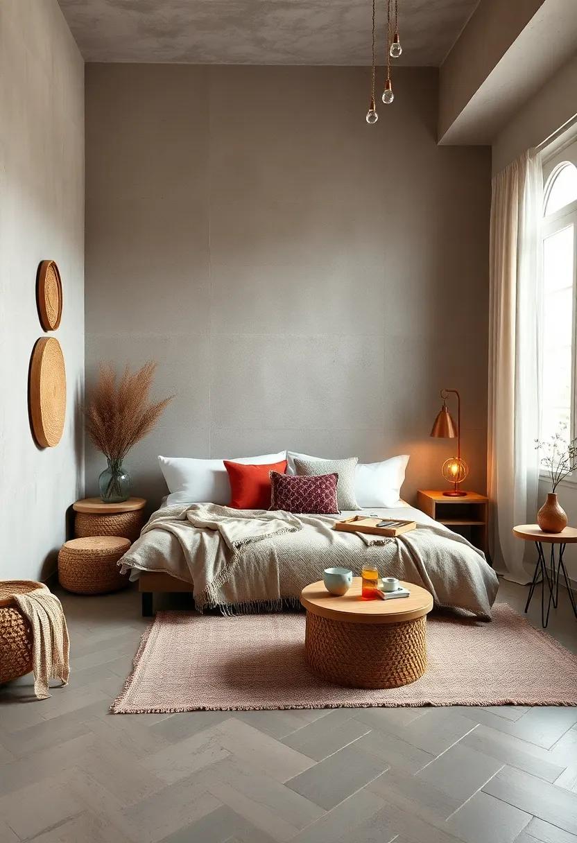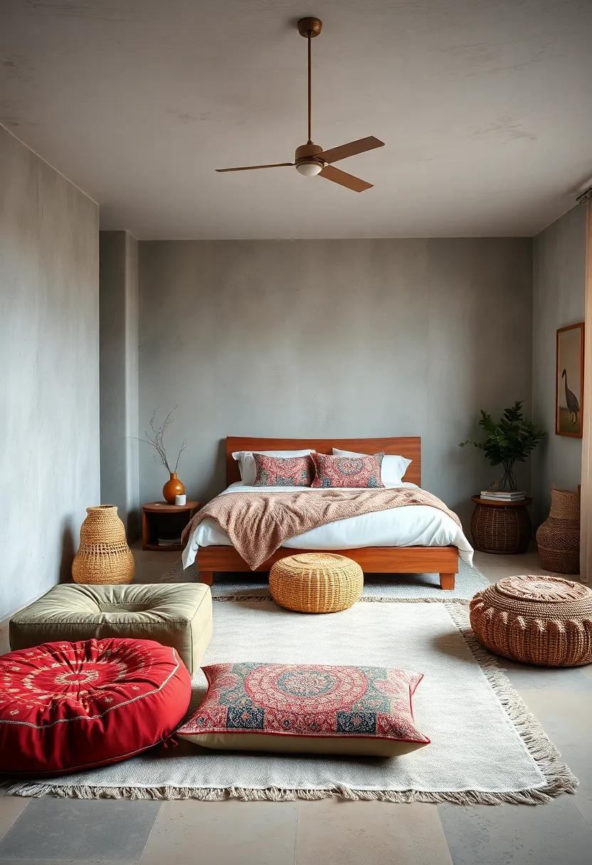 Incorporating oversized floor cushions or poufs into your bohemian bedroom design instantly enhances the cozy vibe, making it a perfect retreat for lounging, reading, or meditating. Diverse textures and colors can be selected to create visual interest, so don’t shy away from fabrics like velvet, cotton, or woven fibers. Consider using earthy tones or vibrant prints that reflect your personal style, allowing these plush accents to harmonize with your existing décor. Arrange a few cushions in a semi-circle along the wall to create an inviting seating arrangement, or stack them in a corner for an eclectic look that encourages relaxation.